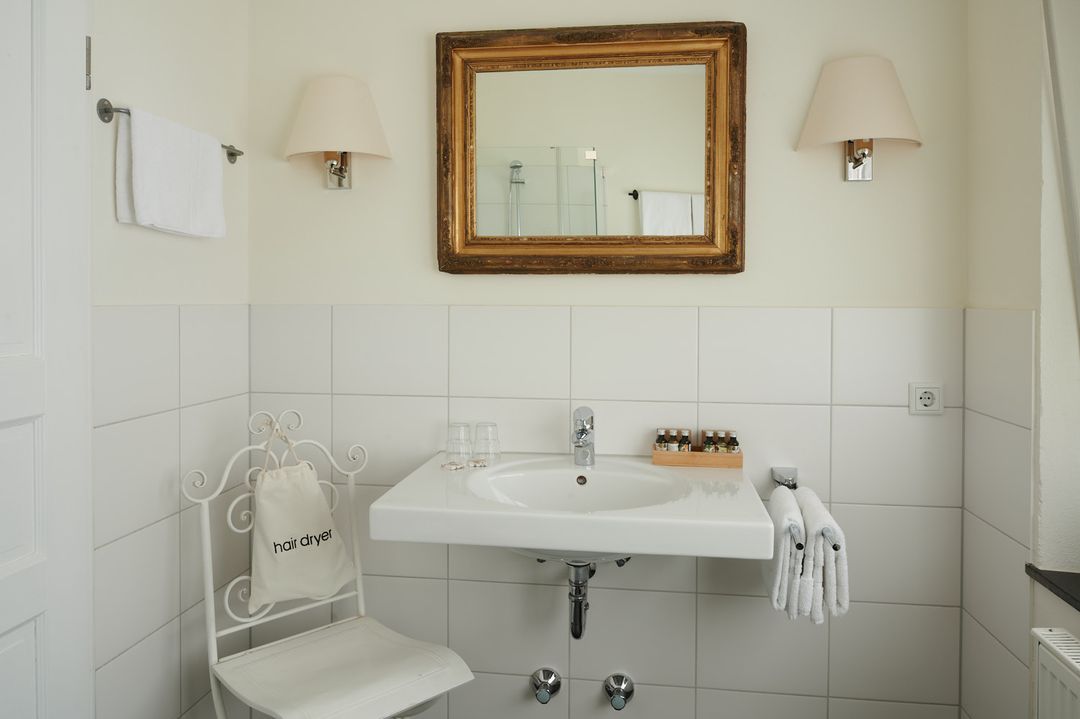 | Ausstattung | Doppelzimmer mit Doppelbett, TV, Bad mit Dusche, WC und Fön, kleine Terrasse, Kaffeemaschine, Mineralwasser und Schloss Wissener Apfelsaft |