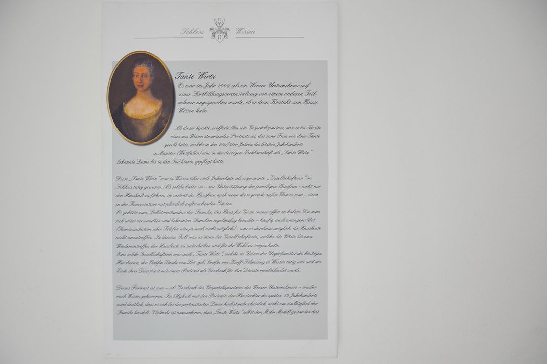 Das ehemalige Schmiedehaus (5) von Schloss Wissen beherbergt insgesamt drei individuell gestaltete Gästezimmer, die sich bei Bedarf zu einer Wohneinheit zusammenfassen lassen. Das Fürstenzimmer Tante Wirtz befindet sich im Obergeschoss des aufwendig restaurierten Gebäudes.